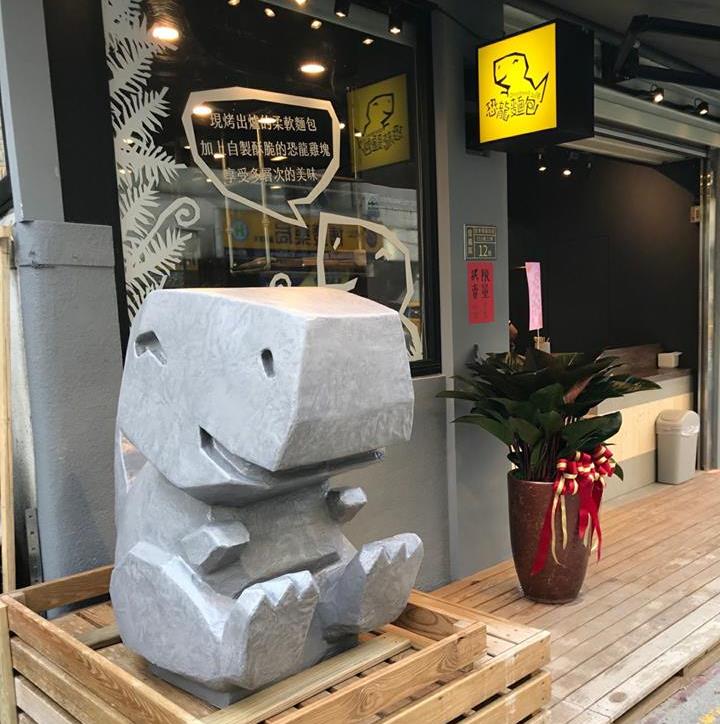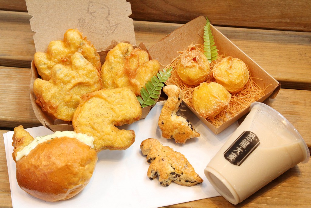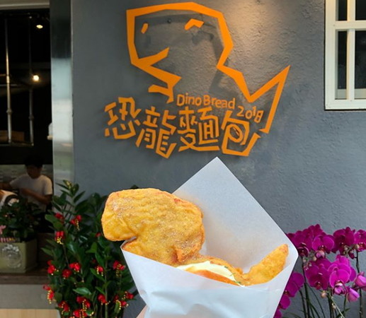 北市松山文创园区附近新开一间恐龙面包,以恐龙造型超大鸡块夹入炸过的面包中,外型相当逗趣,还可以涂抹西红柿酱、蜂蜜芥末酱、柠檬优格酱,一份85元。恐龙干酪蛋则是鸡肉丸包裹着干酪再下锅油炸,一份3颗75元。3月一开幕即成为近期最夯的排队打卡小食。