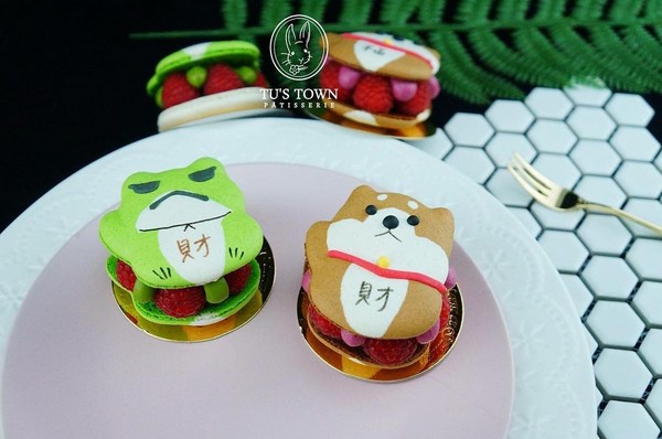旅蛙红透半边天,现在甜点也出现旅蛙和柴犬款!兔思糖以贩卖造型低糖马卡龙为主,一周只卖四到六,一天卖3小时,自从1月起推出招福财蛙、柴犬两款造型,立即让眼尖的蛙迷、柴迷们陷入一阵抢购风潮。招福财蛙是选用丸久小山园抹茶配上覆盆莓;招福财犬则是黑醋栗覆盆莓里头包着一颗完整覆盆莓,价格均为一个180元。