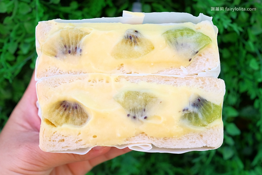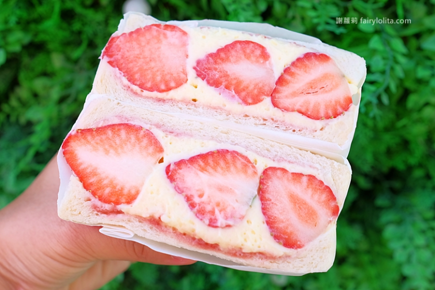 整個三明治內餡包好包滿,草莓大顆吃來爽度也很高,連卡士達都塞得超級飽,咬下去一口就爆漿。