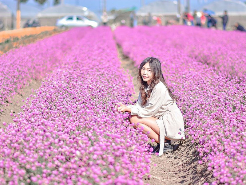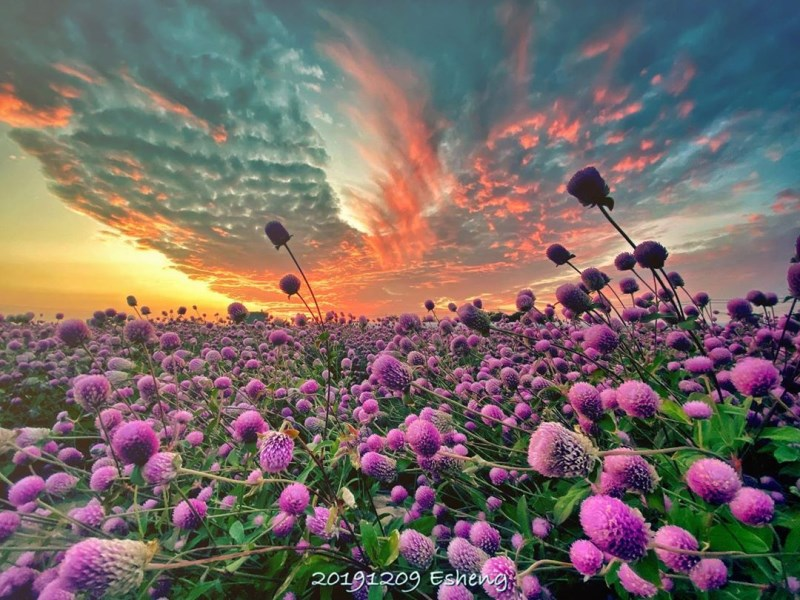 数大就是美,大家看到粉紫色的『圆仔花』,原来是从国外引进台湾的呢,因为花期长又称为『千日红』。现在正逢花开期,特写、人物近拍或远拍,都很好看。除了观赏用以外,还能做成中草药,可治支气管哮喘等功用喔。