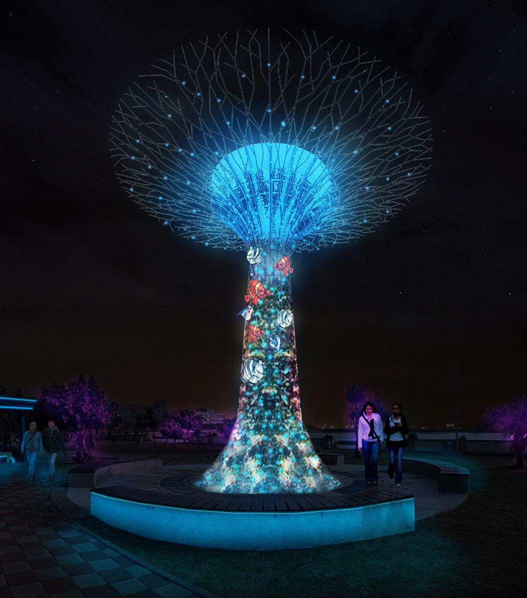 高达五公尺的巨大珊瑚树,乍看之下跟新加坡滨海湾花园的「擎天树」很像,但以珊瑚海底为主题,多采多姿的树身像是完整的生态一般,包容所有海洋生物,形成多彩缤纷的海底世界,不管是上面的珊瑚还是小丑鱼都能地活着斑斓的光点会随着旅人的靠近,而产生移动变化,一定站到前面拍几张照片才可以!